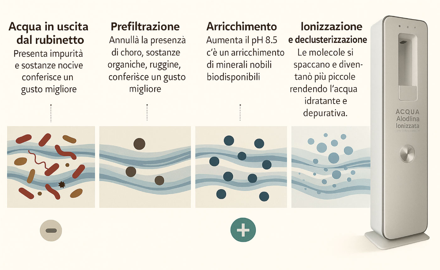 L’Acqua Alcalina Ionizzata con un elevato contenuto di sali minerali fornisce maggiore energia, migliora la circolazione del sangue e accelera il metabolismo, rivitalizzandoci rapidamente.